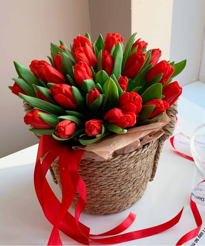 Тюльпаны красные - 35 шт., корзина плетёная гиацинт малая d25 см, тишью.