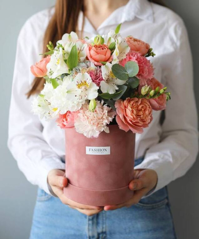 роза кустовая Джульетта - 3шт., альстромерия 3шт., диантус - 7шт., эвкалипт - 1шт., фрезия - 2шт., бархатный бокс d13 см., oasis.