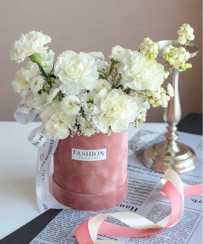 Диантусы, лимониум, эвкалипт, сезонный стаффаж (симфорикарпус на фото), oasis, шляпная коробка бархат d13 см