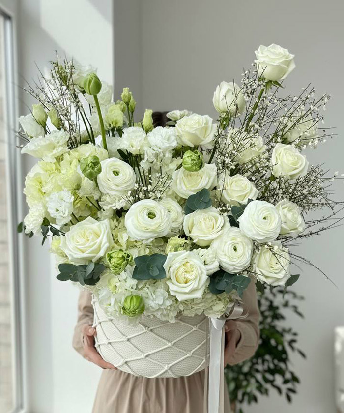 Авторская работа флористов делает корзину гармоничной и выразительной: разные фактуры цветов создают глубину композиции, а белая палитра придаёт ей благородный и премиальный вид.