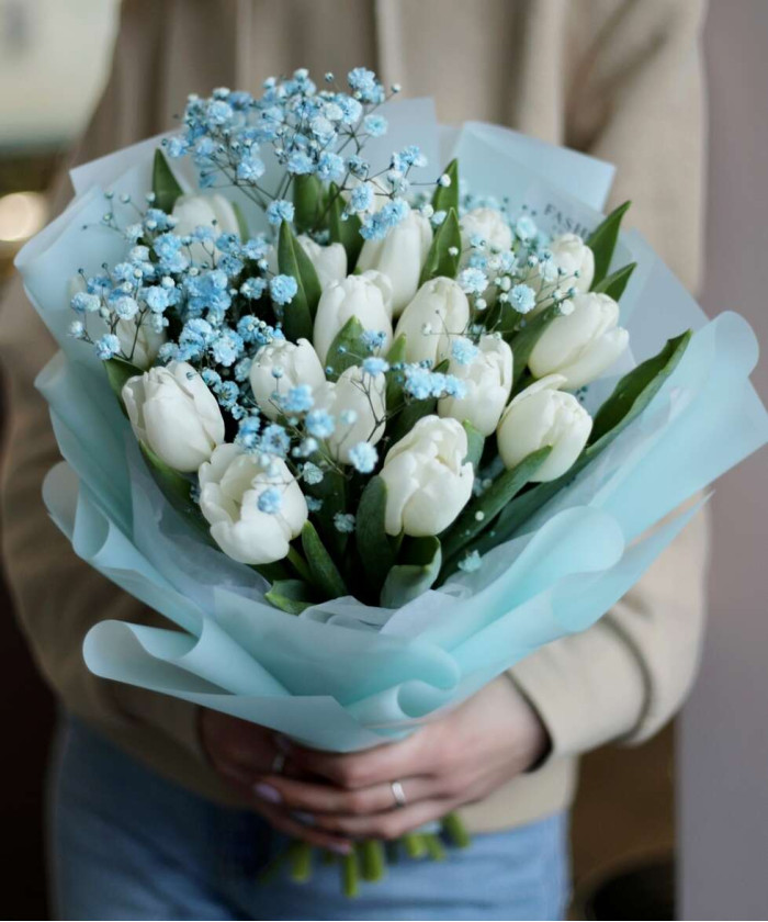 Тюльпан Антарктика - 17 шт., Гипсофила блу - 1 шт., Фирменная упаковка.