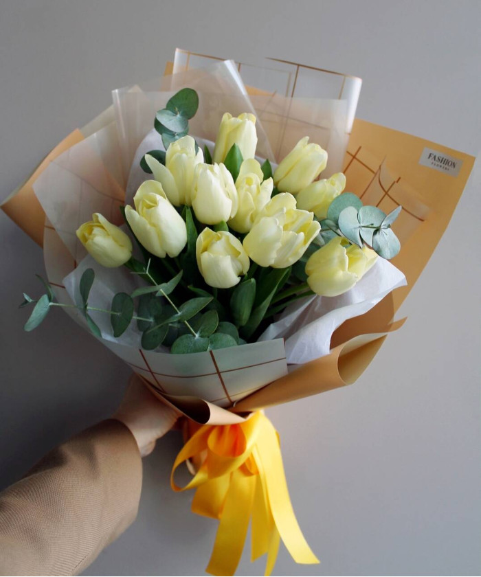 Тюльпаны лимонные - 11 шт., Эвкалипт - 1 шт., Фирменная упаковка.
