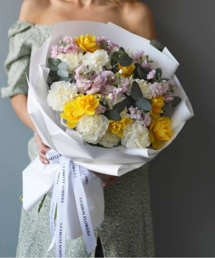 Маттиола кустовая - 4шт., нарцисс - 7шт., диантус - 11шт., эвкалипт - 1шт., фирменная упаковка.