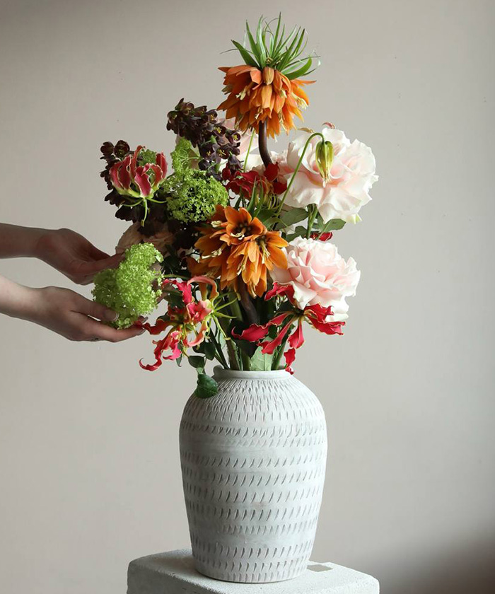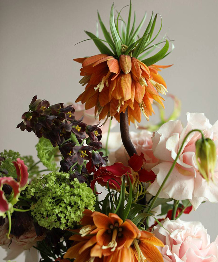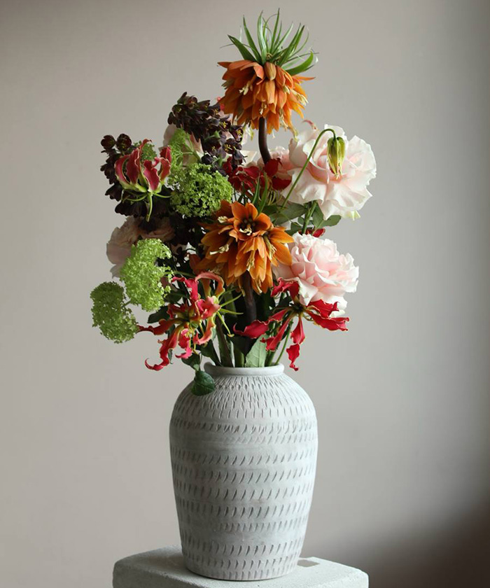 Фритиллярия добавляет графичности и необычной формы, глориоза — яркие огненные акценты с изящными изогнутыми лепестками, а вибурнум смягчает композицию, добавляя свежесть и объём. Ваза завершает образ, превращая букет в готовое интерьерное решение.