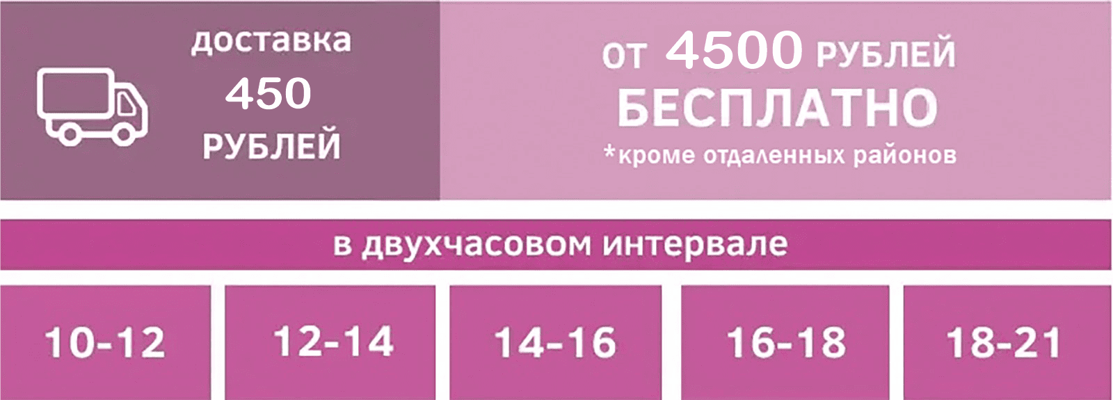 В праздничные и предпраздничные дни (28 и 29 ноября День матери; 14 февраля; 6, 7, 8 марта; 31 августа; 1 сентября; 30, 31 декабря) тариф доставки: зелёная зона - 650руб., жёлтая - 950руб., синяя - 1200руб., красная - 1600руб., розовая - 2300руб.; Бесплатная доставка не осуществляется.