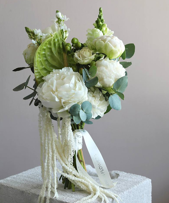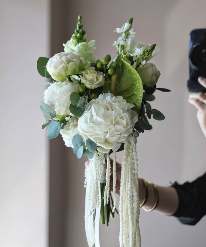 Этот букет будто сошёл с вдохновляющих свадебных кадров — но он создан для обычного дня. Без повода, без даты, просто потому что красота должна быть рядом. Пышные пионы, благородные оттенки, фактурный антуриум и капли зелени собраны в стильную композицию, где каждая деталь — на своём месте.