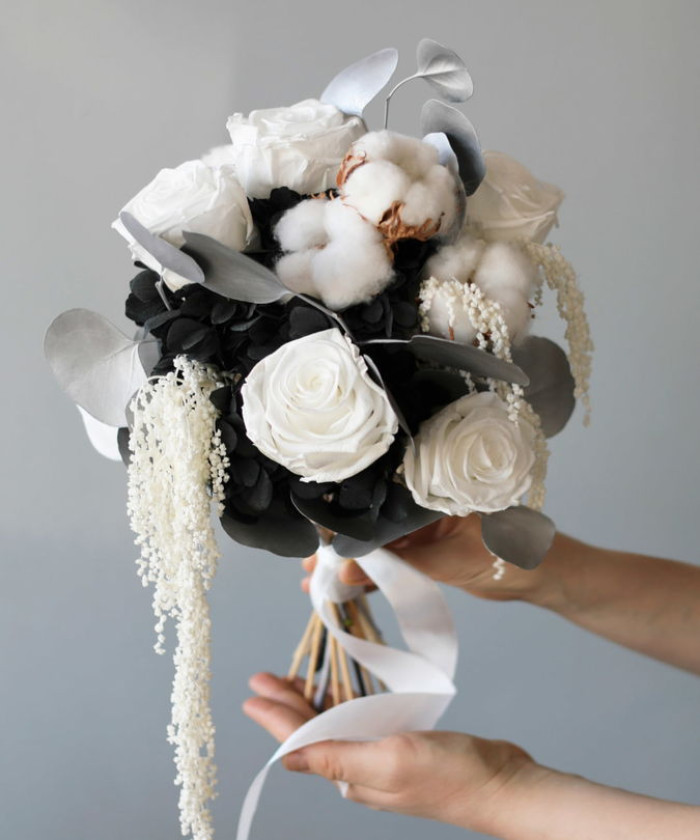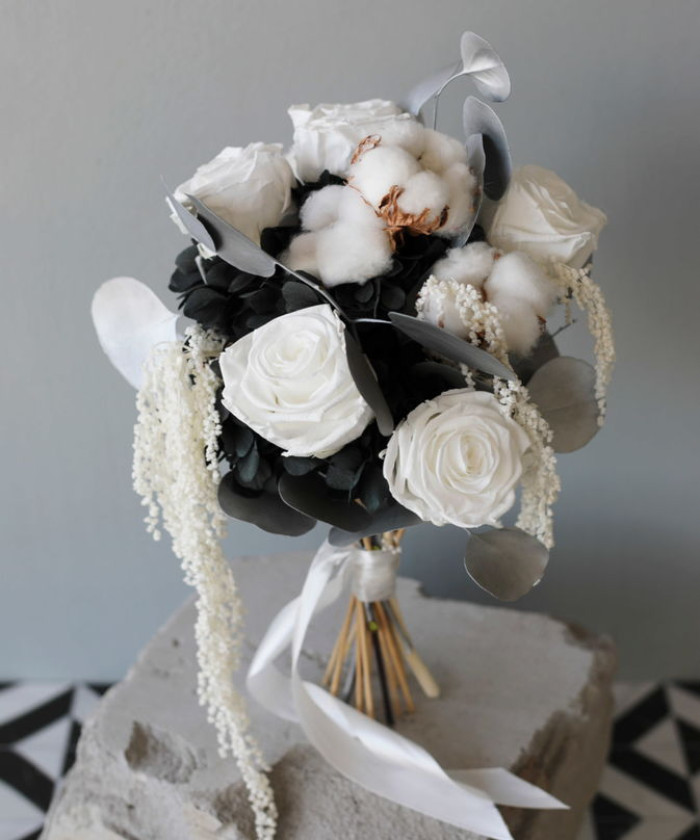 Гортензия стабилизированная, Роза стаб., Эвкалипт стаб., Фирменная упаковка.