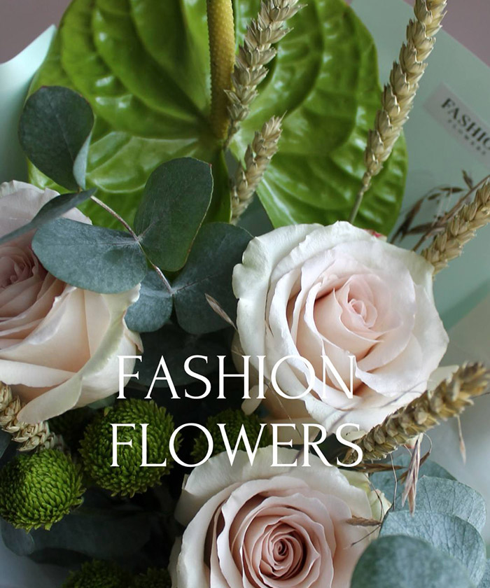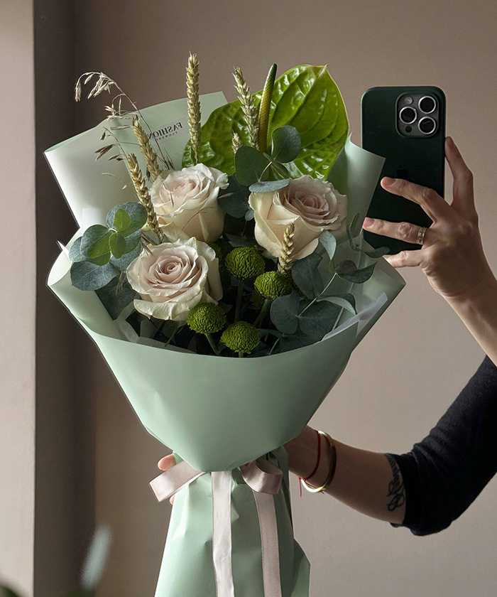 "Эстетик" букет с зелёным антуриумом и кремовыми розами Квиксенд №4347