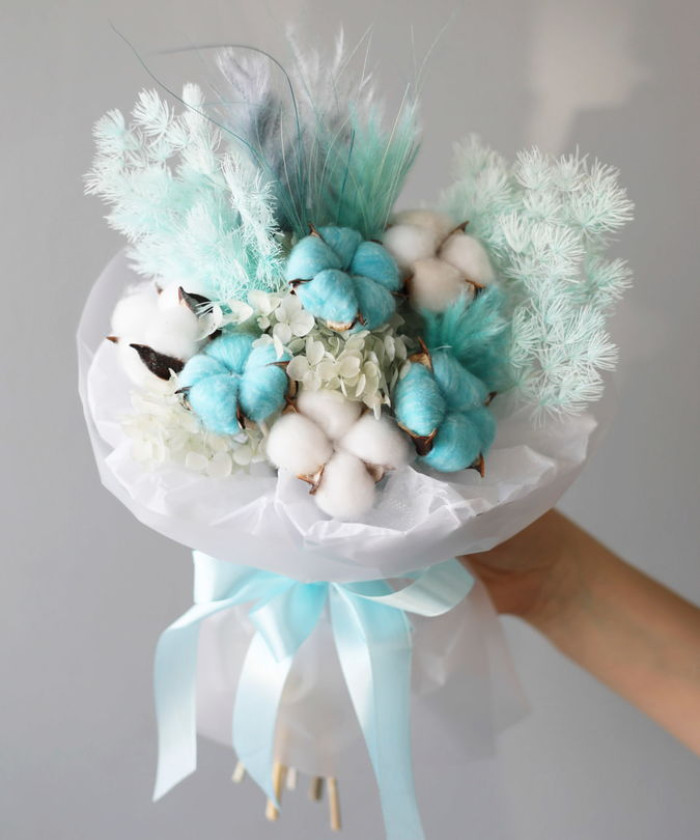Гортензия стабилизированная, Аспарагус, Хлопок, Стифа, Фирменная упаковка.