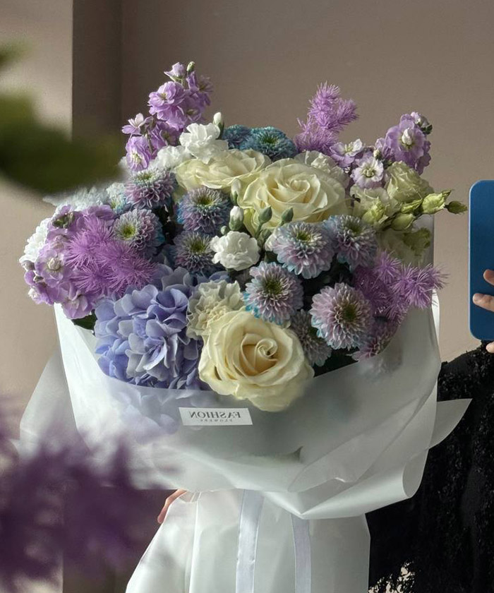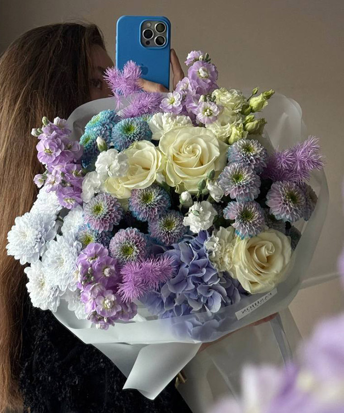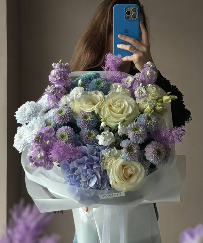 Букет «Галактика» — это выразительная авторская композиция с гортензией Milka, созданная в глубоких сиренево-фиолетовых оттенках. Он словно отражает космическую красоту и бесконечность, соединяя таинственность и элегантность.