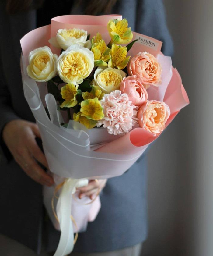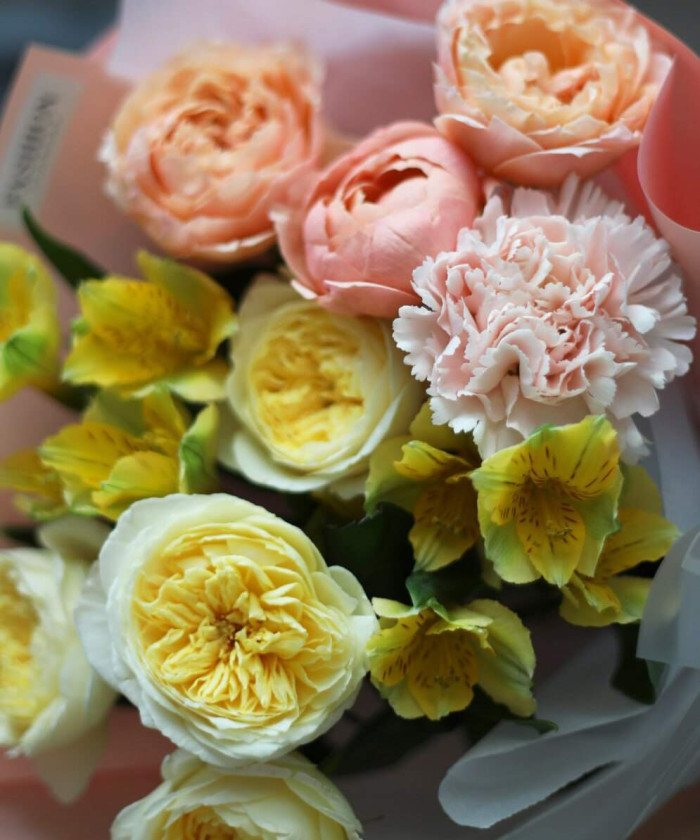 Роза кустовая Джульетта - 1 шт., роза кустовая Роял Парк - 1 шт., Диантус - 1шт., Альстромерия - 2 шт., Фирменная упаковкаНет отзывов о данном товаре, станьте первым, оставьте свой отзыв.