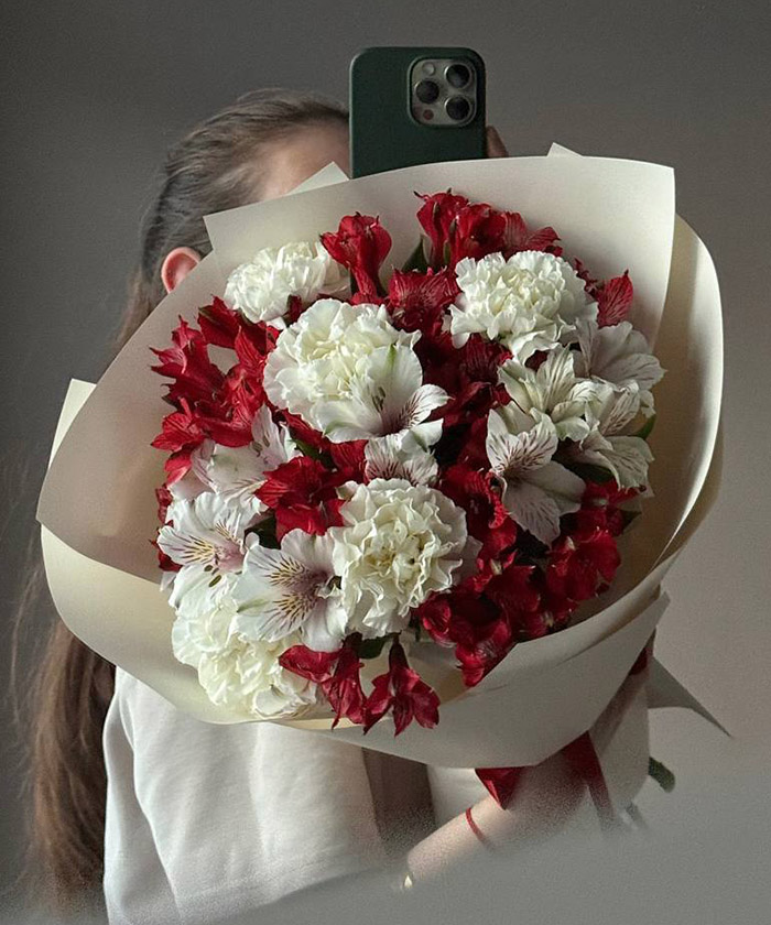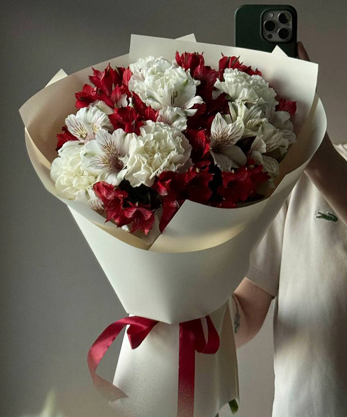 Букет «История любви» — это нежный и в то же время выразительный подарок, наполненный смыслом и эмоциями. Сочетание белых и красных альстромерий с утончёнными диантусами символизирует гармонию чувств, искренность и тёплую привязанность. Такой букет идеально подойдёт для признания в любви, годовщины, дня рождения или просто красивого знака внимания.