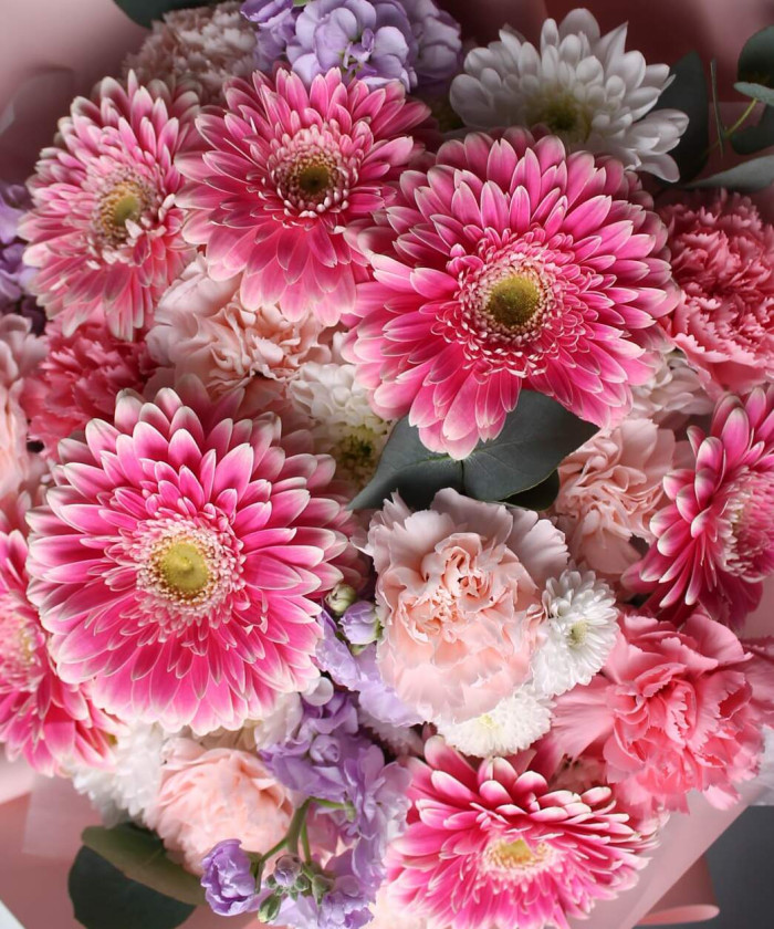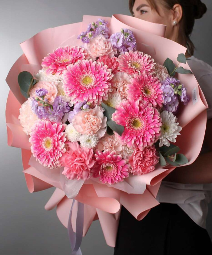 Гербера помпон - 7шт., диантусы - 10шт., маттиола кустовая - 3шт., хризантема кустовая Коконат - 1шт., хризатема кустовая бел. - 2шт., Эвкалипт - 1 шт., Фирменная упаковка