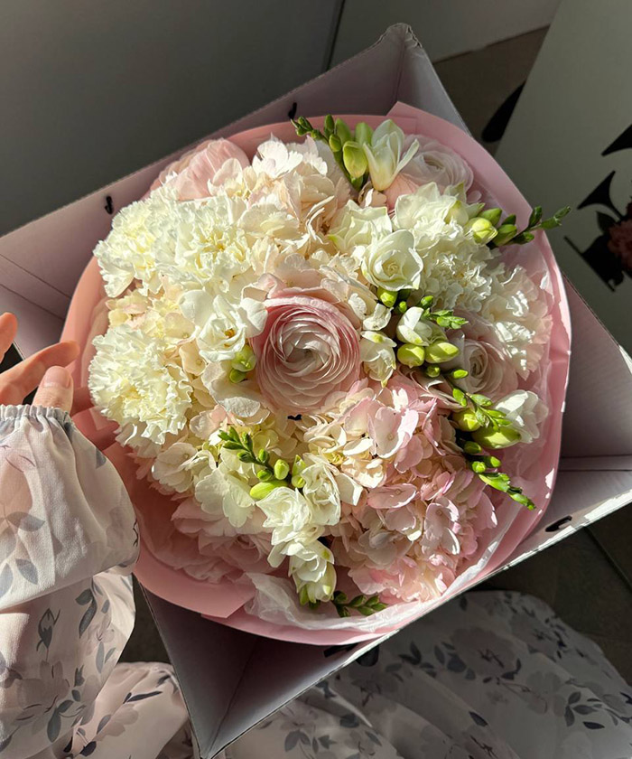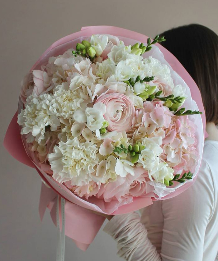 "Лёгкий румянец" авторский букет с ранункулюсами, фрезией и гортензиями №5982