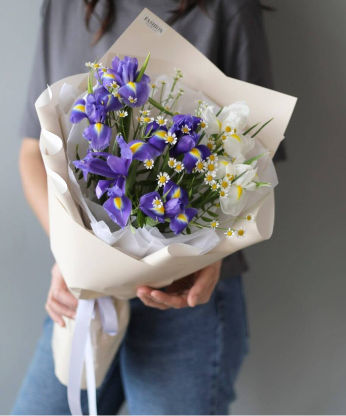 Ирис микс - 7 шт., танацетум - 4 шт., фирменная упаковка