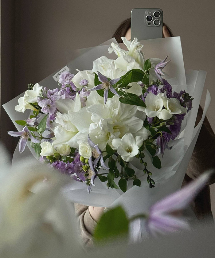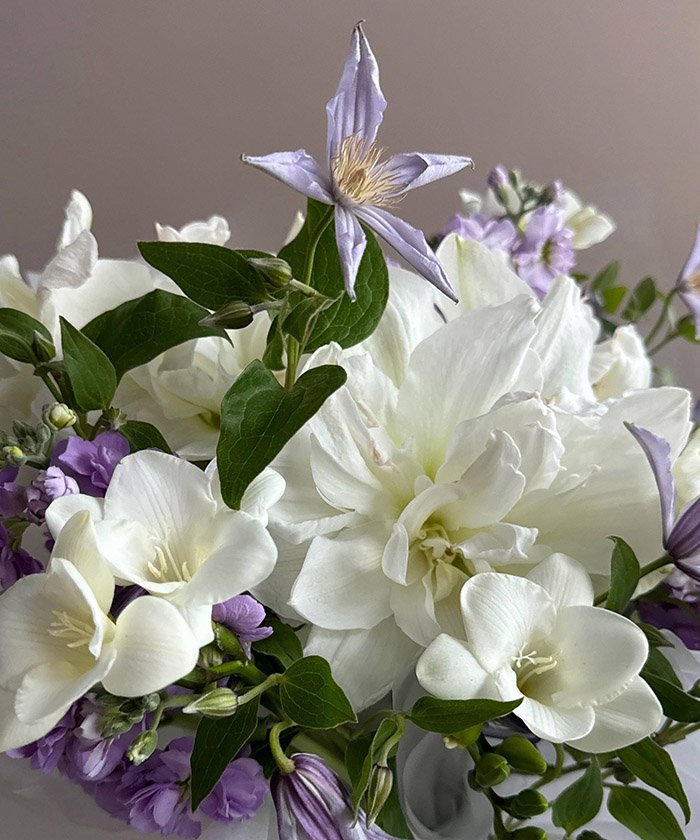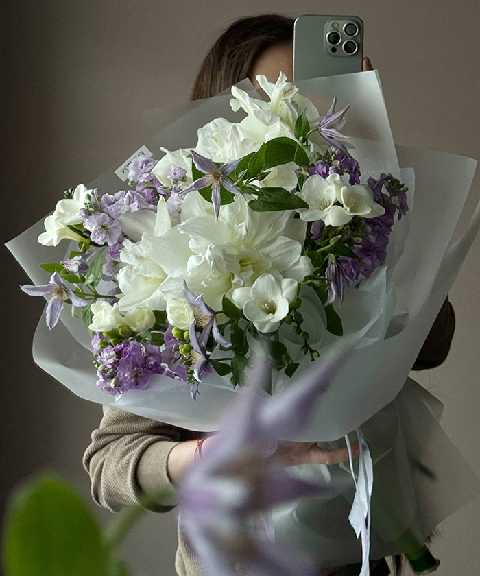 "Лиловые сны" авторский букет с клематисом и маттиолой №8768