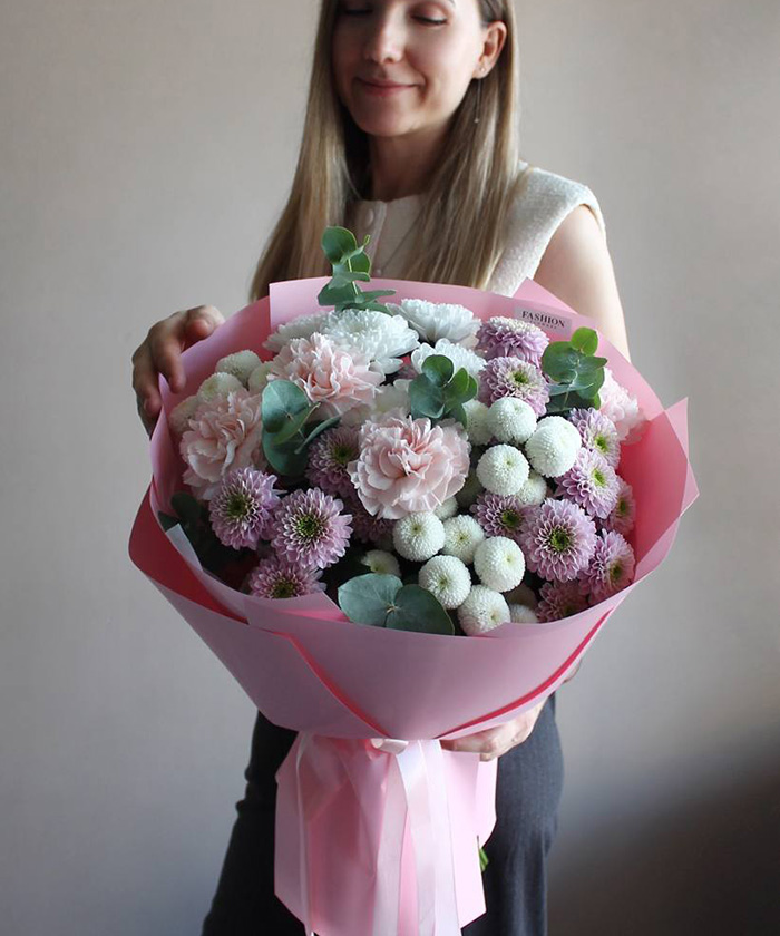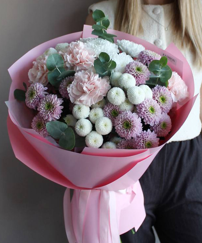 Букет «Любовь в цветах» — это воплощение романтики и нежности. В его составе — хризантемы и диантусы в бело-сиреневой гамме, объединённые в утончённую композицию с мягкими переходами оттенков. Такой букет идеально подойдёт для признания в любви, дня рождения или просто как знак внимания.