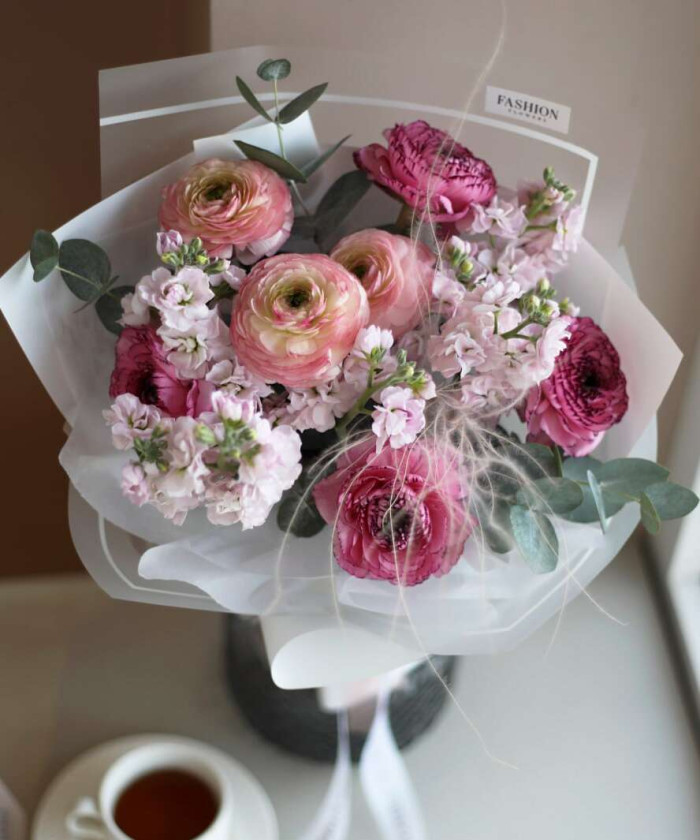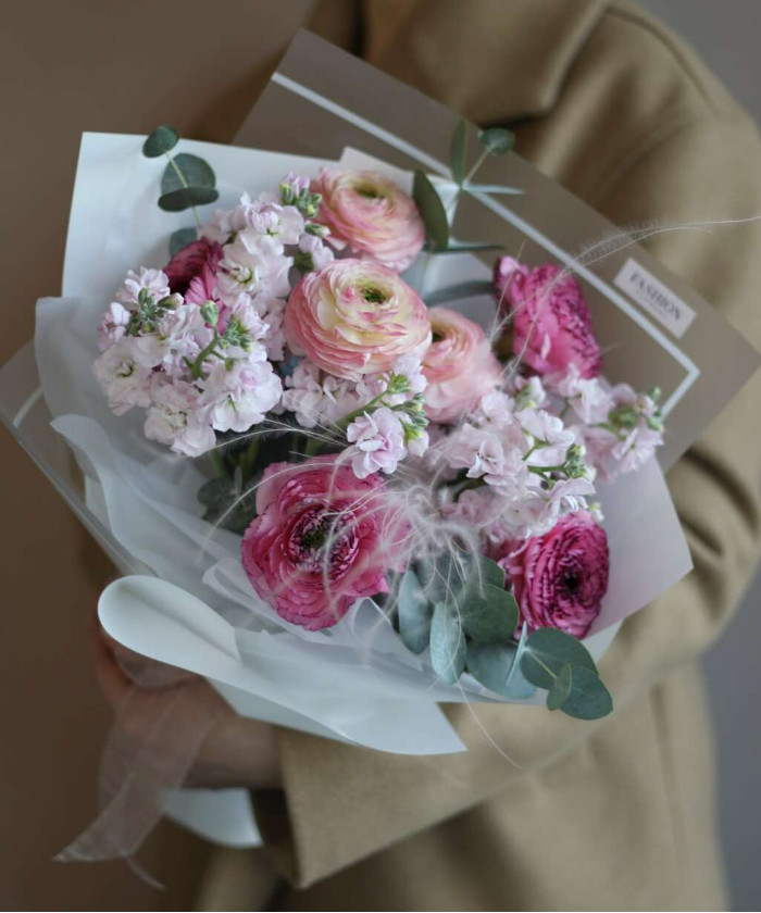 Ранункулюс Италия - 7 шт., маттиола куст. - 2шт., Эвкалипт - 1 шт., стифа 1шт., Фирменная упаковка