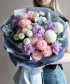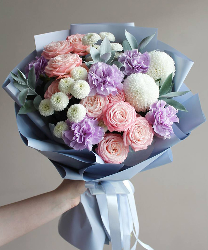 Авторский букет «Лунный поцелуй» — гармоничное сочетание кустовых роз Бомбастик и лавандовых диантусов Мун аква и подобранной в тон композиции, создающие романтичную и утончённую атмосферу.