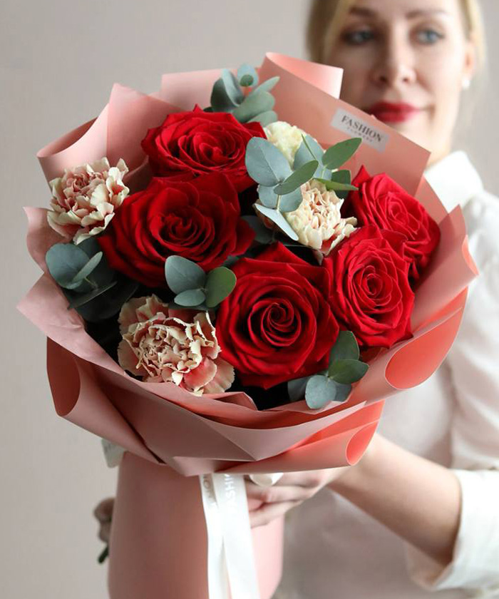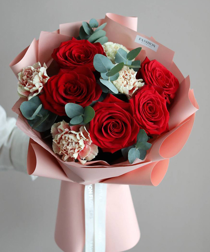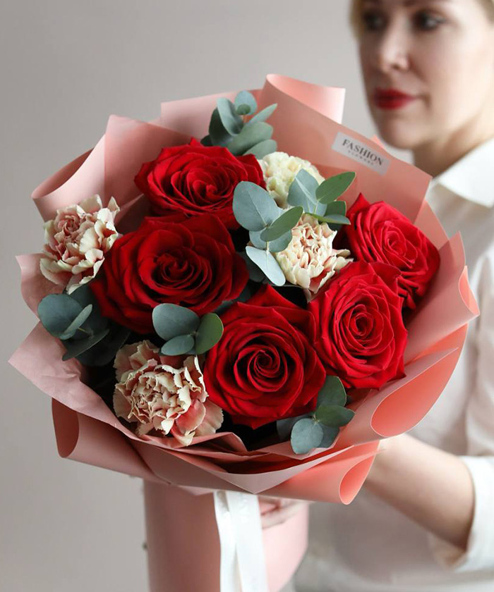 Красный букет может быть не только страстным, но и удивительно изысканным. Букет «Мерлетто» от салона Fashion Flowers — это виртуозная игра фактур. Мы соединили классическую форму алых роз с «кружевными» краями диантусов (премиальных гвоздик), создав композицию, которую хочется рассматривать бесконечно в Иркутске.
