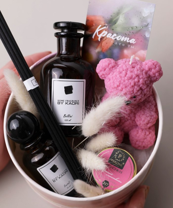 Парфюм для дома By Kaori 50 мл., Арома-диффузер By Kaori 100 мл., Свеча соевая Мишка, Мёд-суфле Peroni 30 мл., коробка подарочная, открытка, декор.