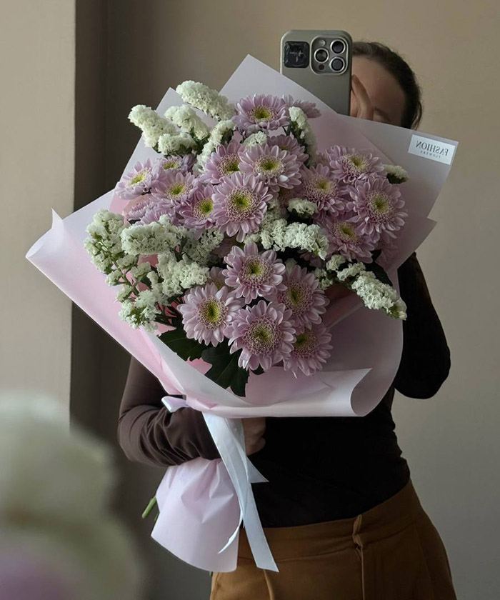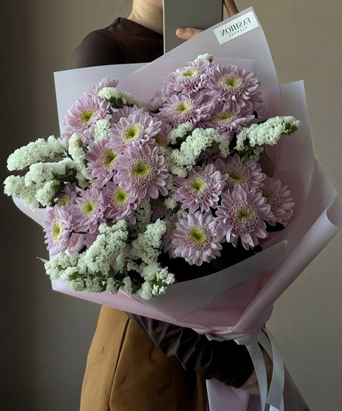 "Нежно о главном" букет с розовыми хризантемами №4579