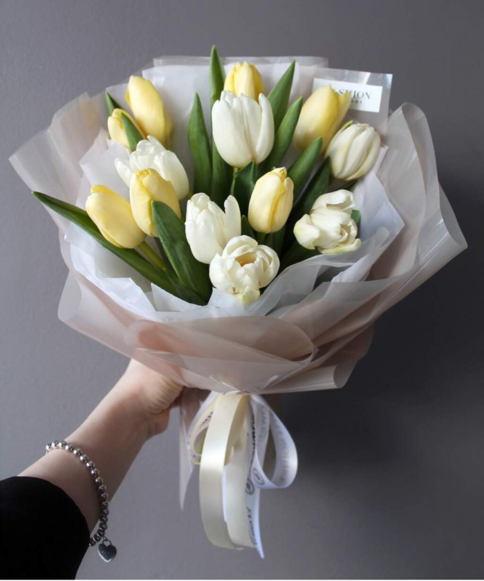 Тюльпаны лимонные и белые - 13 шт., Фирменная упаковка