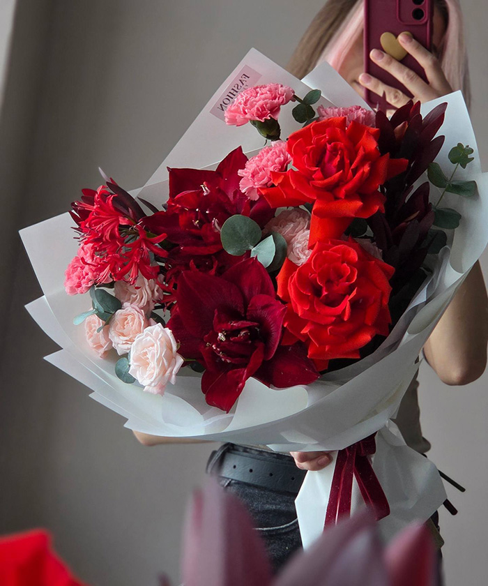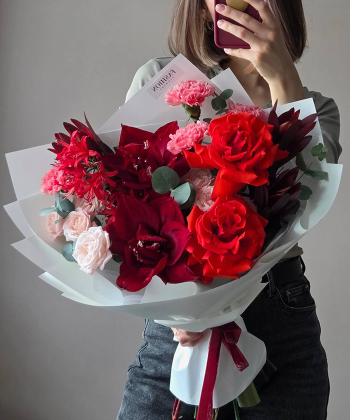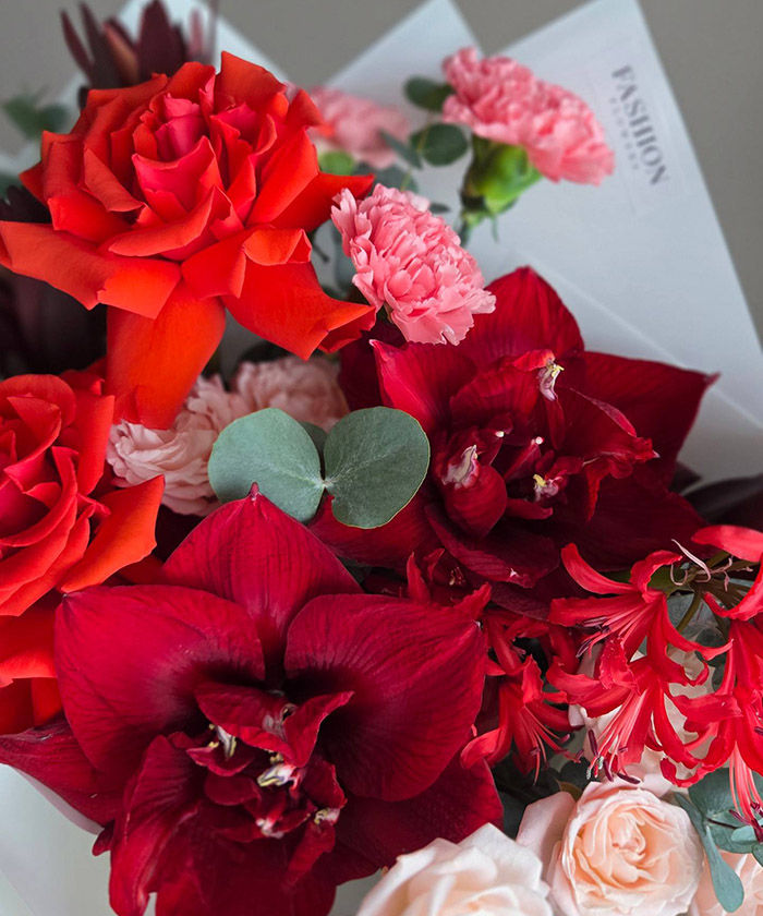 Букет «Пламя» - это яркое воплощение страсти и элегантности. В его составе роскошные французские розы насыщенного красного оттенка и эффектный амариллис, создающий объем и выразительность. Такой букет станет идеальным подарком на день рождения, юбилей, романтическое свидание или любое торжество.