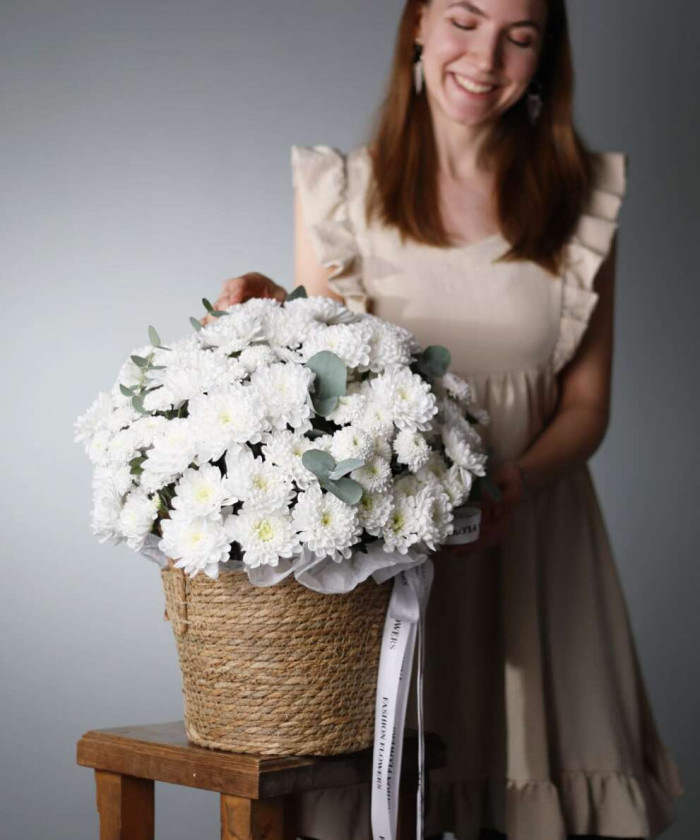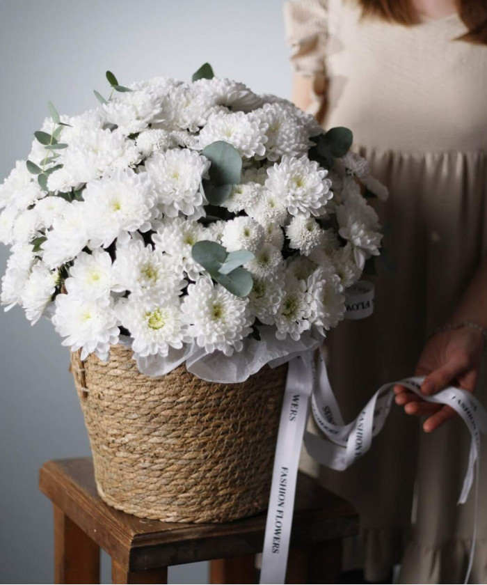 "Пломбир" корзина с белыми хризантемами Алтай и Коконат №2469