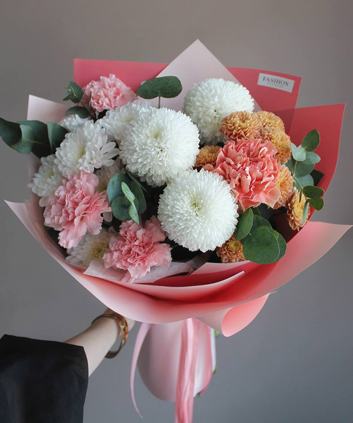 В его составе: розовые диантусы, белые хризантемы, оранжевые сантини, кустовая хризантема «Алтай», диантусы сорта «Карамель» и веточка эвкалипта цинерия.