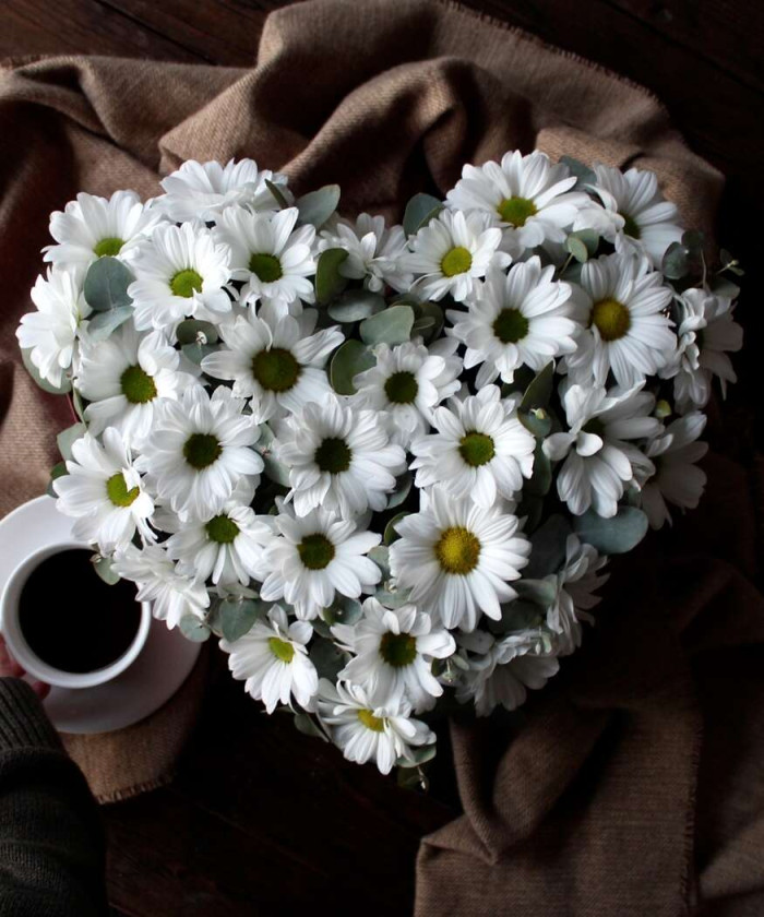Коробка сердце 30*23*h10,5см., Хризантема куст. Бакарди бел., Эвкалипт, Оазис.