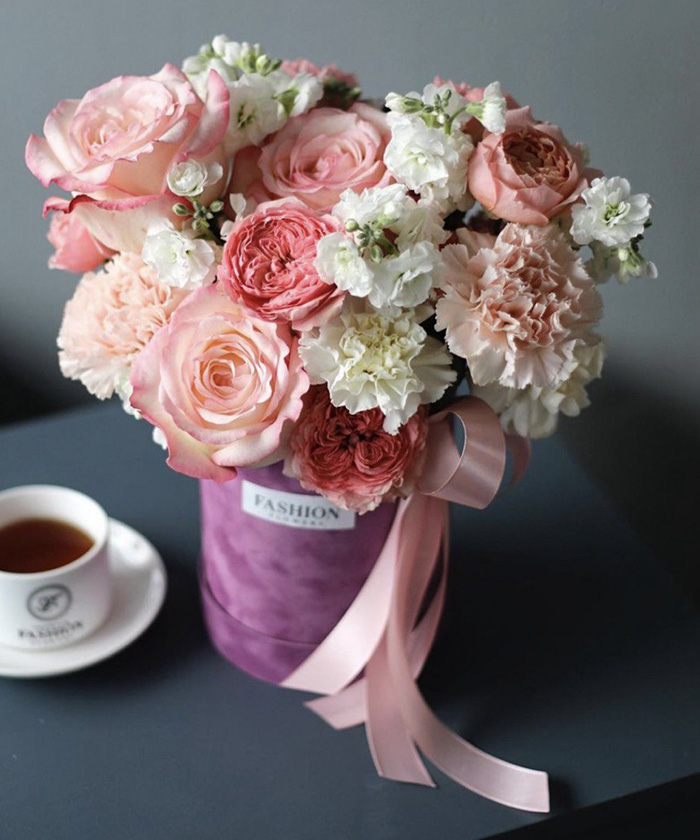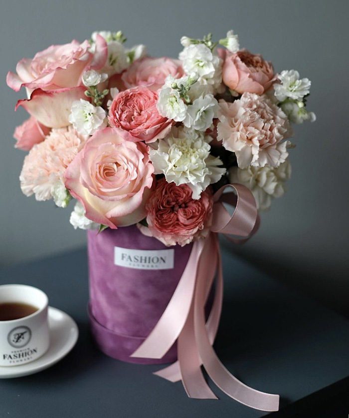 Розы, диантусы, маттиола, бархатный бокс, тишью, лента, оазис.