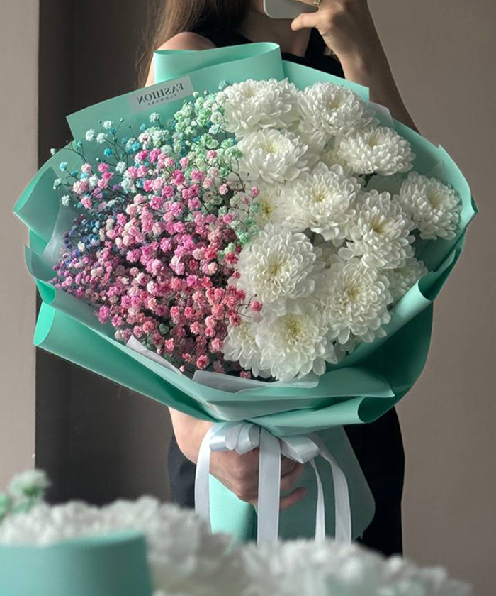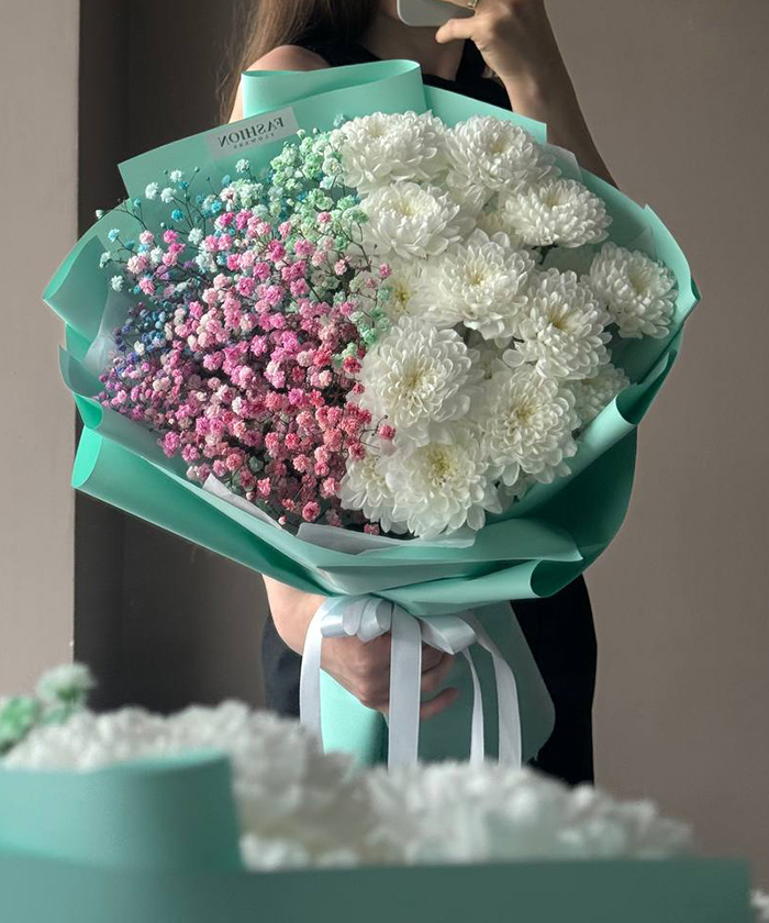 «Сахарная вата» — это букет для тех, кто всё ещё верит в чудеса. Белоснежные хризантемы Алтай и радужная гипсофила создают настроение лёгкости, как из детства: беззаботное, трепетное, чистое. Такой букет подойдёт для поздравления, поддержки или просто как способ подарить немного счастья — себе или близким.