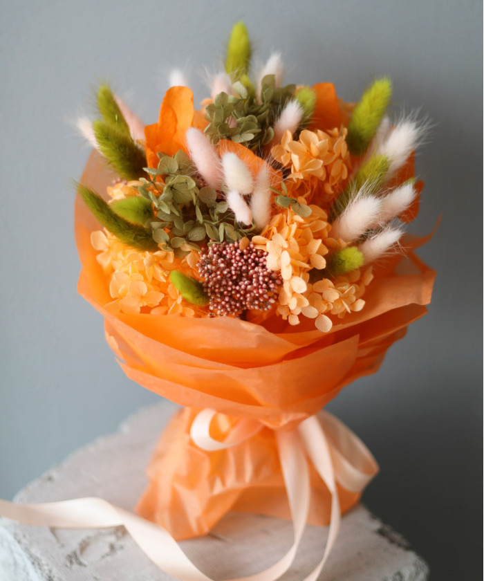 Гортензия стабилизированная, Хлопок, Лагурус, Озотамнус, Эвкалип стаб., Фирменная упаковка.