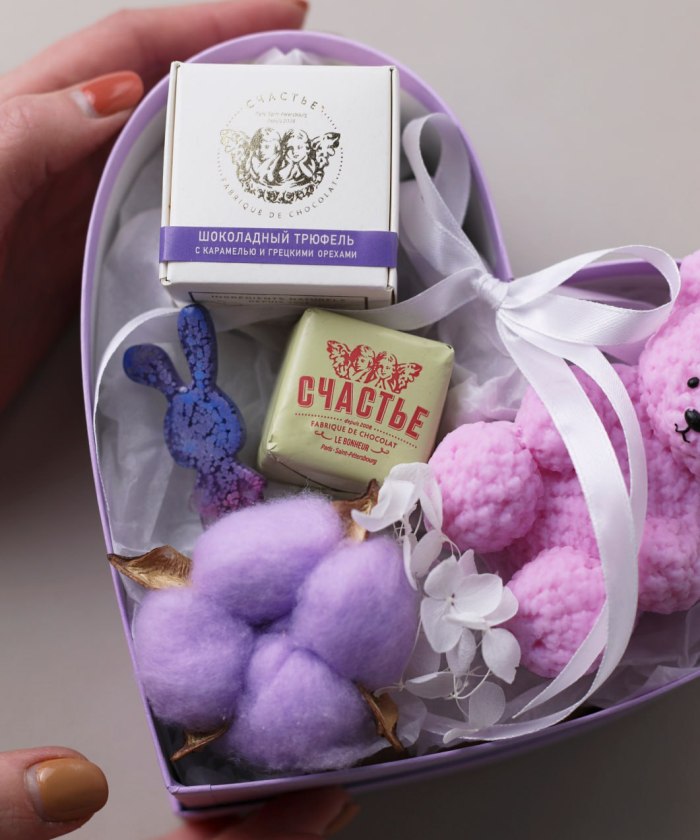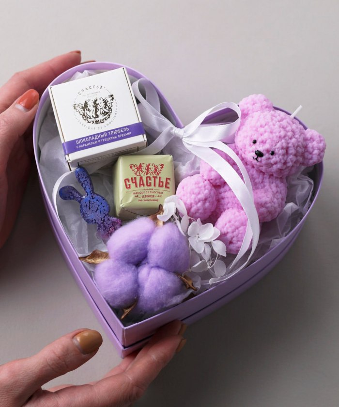 Свеча Мишка, брошь эпоксидная, конфета "Счастье", Гранд трюфель "Счастье", хлопок, коробка-сердце, декор.