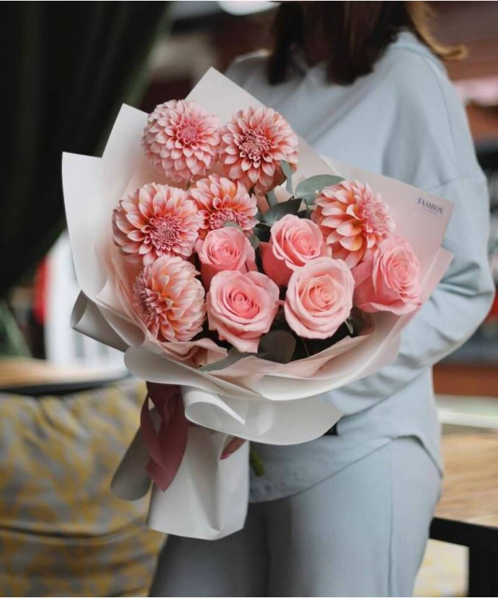 Роза Салма - 5 шт., Георгин Роял - 6 шт., эвкалипт, Фирменная упаковка