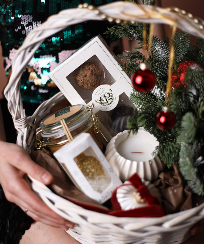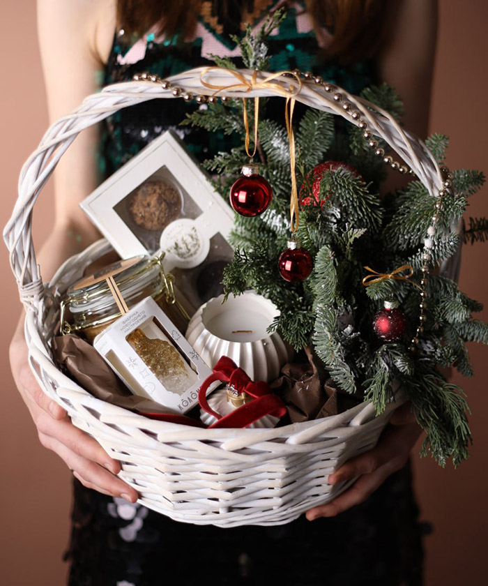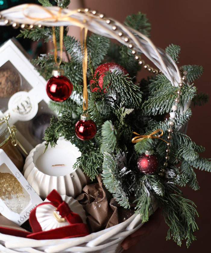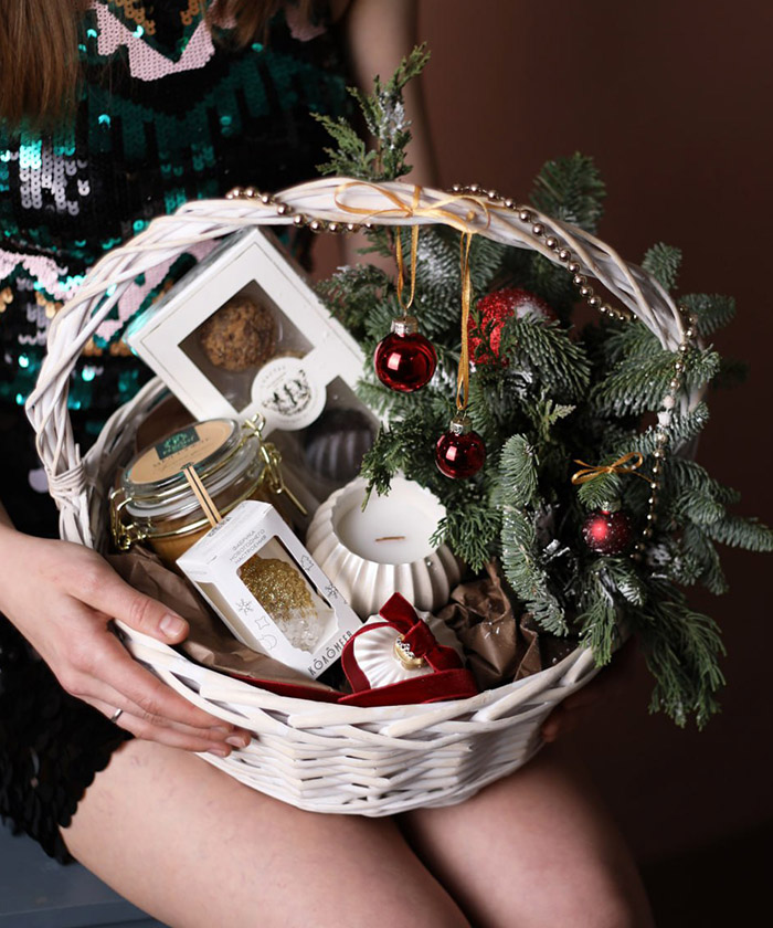 Премиальный новогодний подарок в корзине: стильное оформление, свежие компоненты и праздничное настроение. Закажите набор с доставкой по Иркутску в Fashion Flowers!