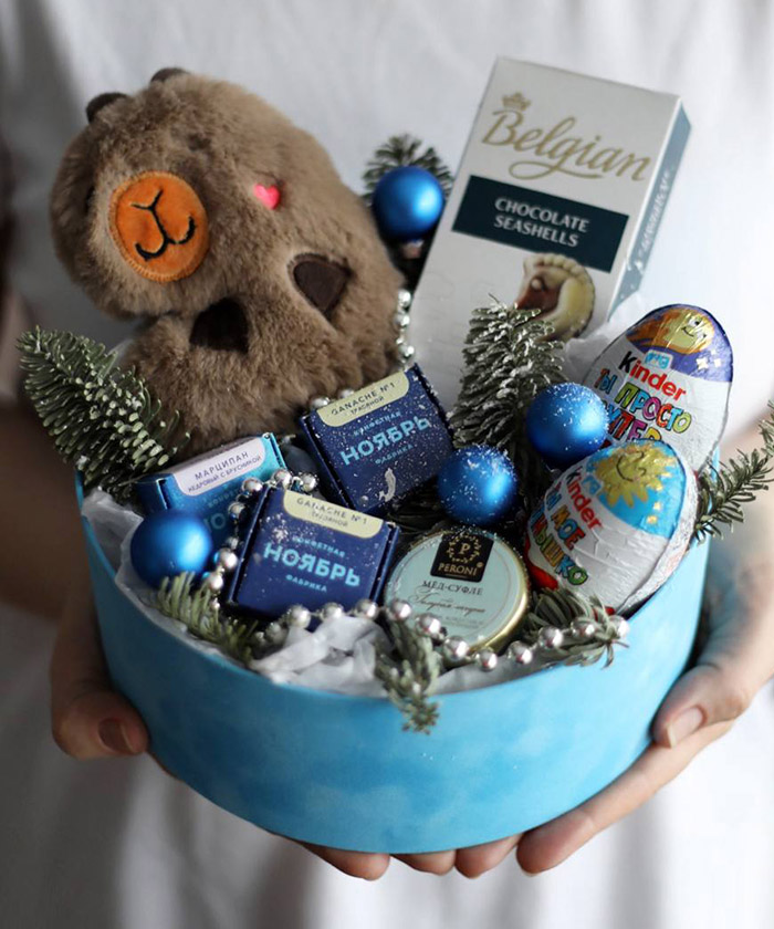 Ищете необычный и трендовый подарок для ребенка? Набор «Сладкий Новый год» от салона Fashion Flowers - это идеальное сочетание милой мягкой игрушки и любимых лакомств. Главный герой набора - очаровательная капибара, которая стала настоящим хитом этого года, а дополнение в виде киндер-сюрпризов сделает праздник по-настоящему сладким.
