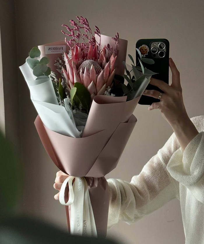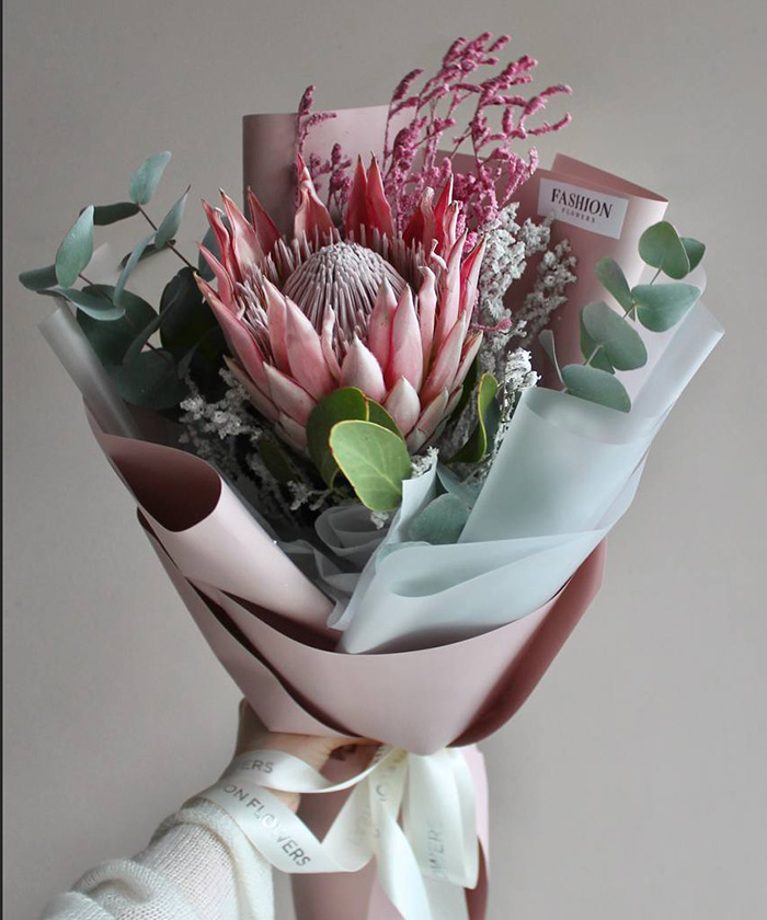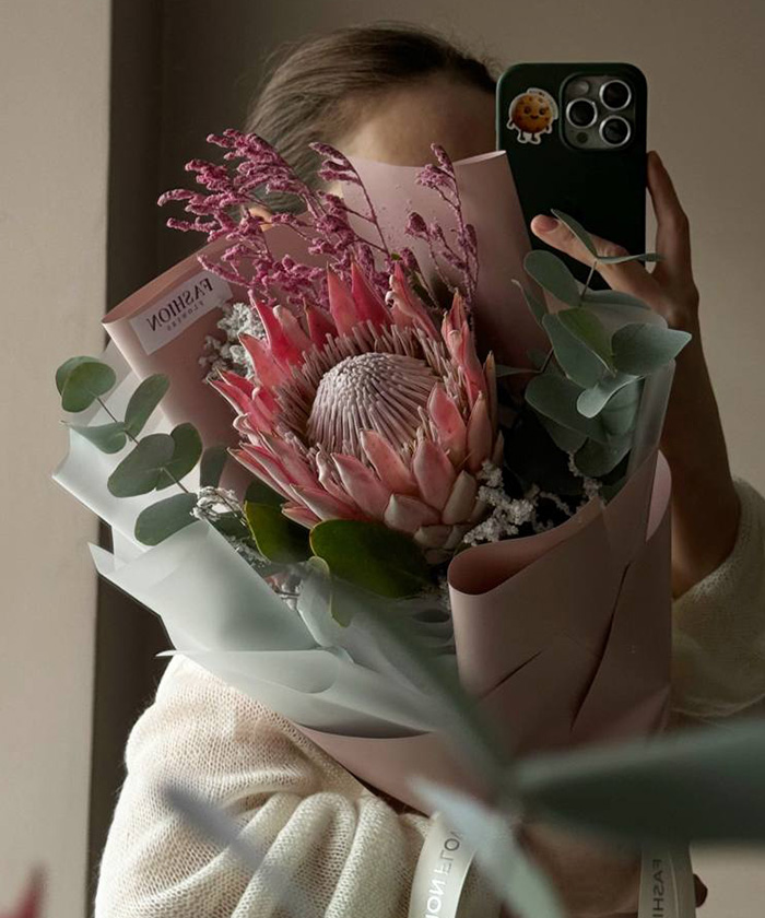 Существуют цветы, которые не нуждаются в представлении. Букет «Снежная королева» от салона Fashion Flowers — это ода мощи и красоте природы. В центре композиции — величественная розовая протея Кинг, настоящий «цветок-корона», который мгновенно заявляет о высоком статусе подарка и безупречном вкусе дарителя в Иркутске.