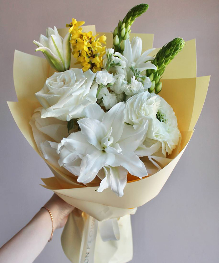 «Солнечный свет» — это букет про ясность, тепло и внутреннее спокойствие. Королевская лилия здесь звучит уверенно и благородно, а орнитогалум добавляет лёгкости и свежести, будто в композицию впустили утренний воздух.