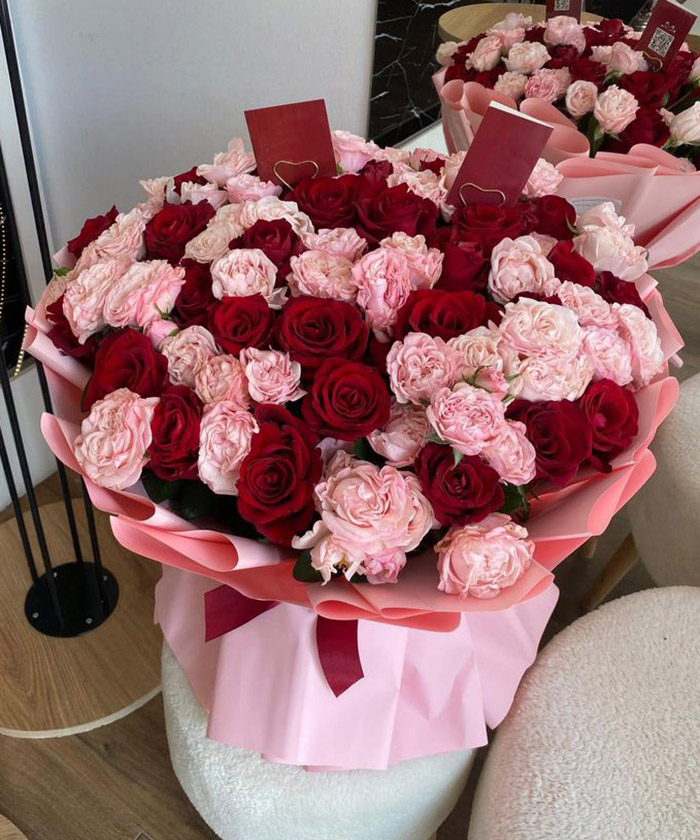 "Страсть" красные розы и кустовые пудровые розы №4233