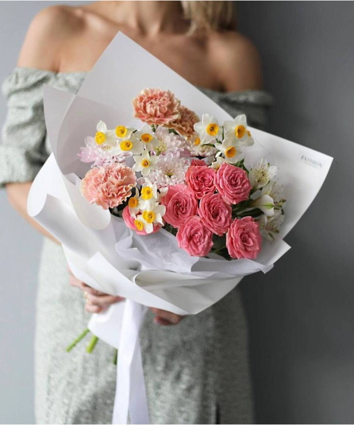 альстромерия - 1шт., диантус 3шт., нарцисс - 3шт., роза кустовая розовая Бол Музетт - 1шт., хризантема куст. краш. - 1шт., фирменная упаковка.Нет отзывов о данном товаре, станьте первым, оставьте свой отзыв.