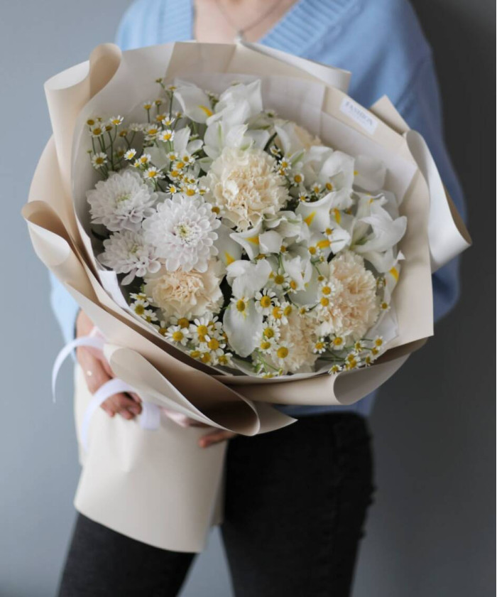Хризантема Алтай - 1 шт., альстромерия - 1 шт., диантусы - 5 шт., Танацетум - 7 шт., ирисы белые - 7 шт., фирменная упаковка