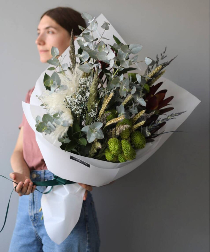 эвкалипт 5шт., леукодендрон 2шт., колосья 10шт., кортадерия росщип, хризантема грин 3шт., колоски рожь 10шт., фирменная упаковка.