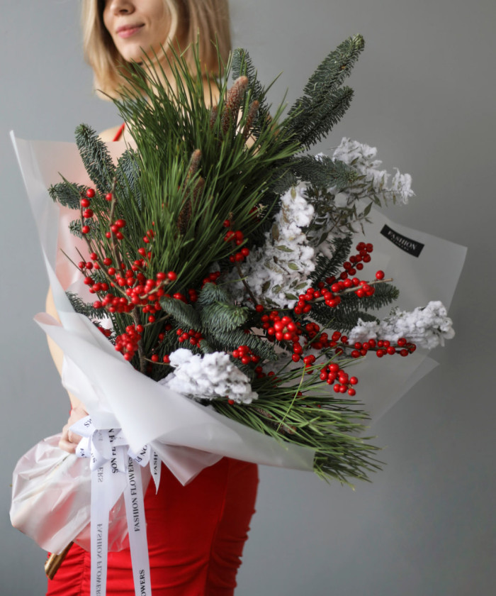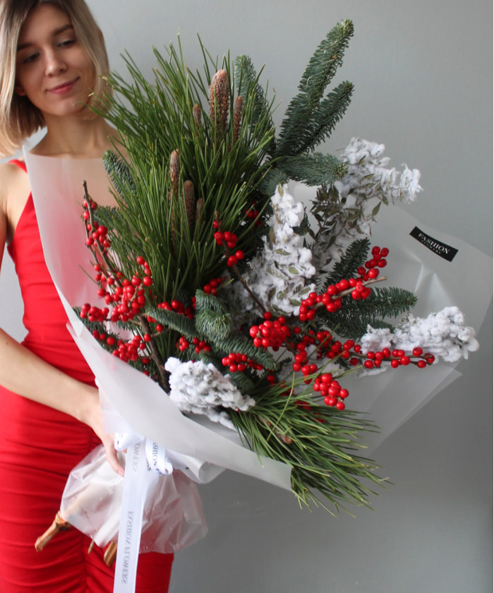 Нобилис, Сосна Италия, Рускус иглица заснеж. - 4 шт., Илекс - 2 шт., Фирменная упаковка.