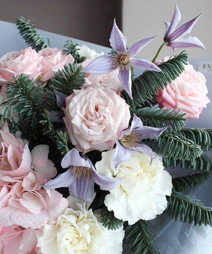 Букет «Зимняя нежность» — это гармоничная композиция из гортензии, кустовых роз и клематисов, которая сочетает нежность, свежесть и выразительность. Пышные гортензии добавляют объём, кустовые розы создают изысканность, а клематисы привносят лёгкость и декоративность.