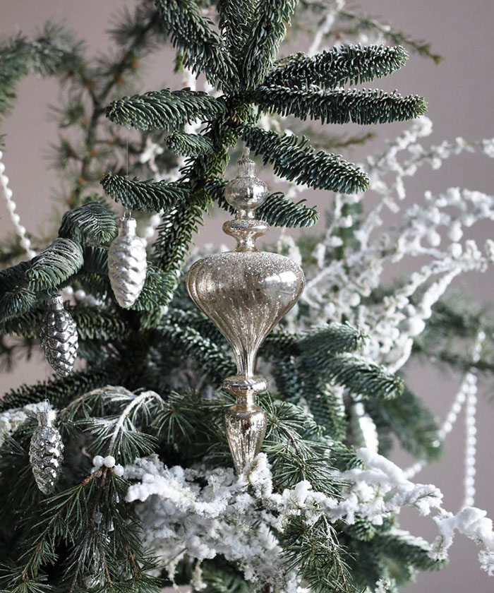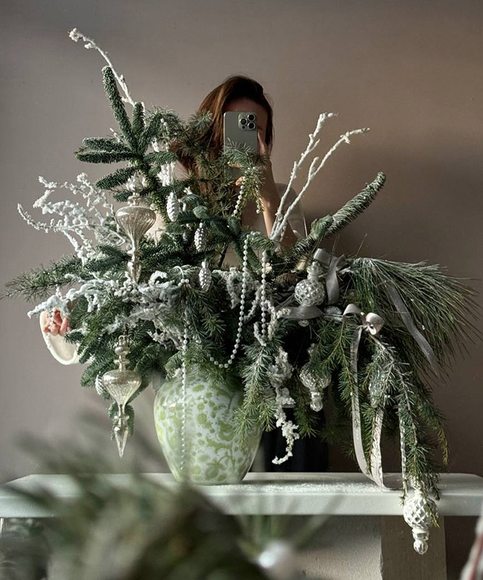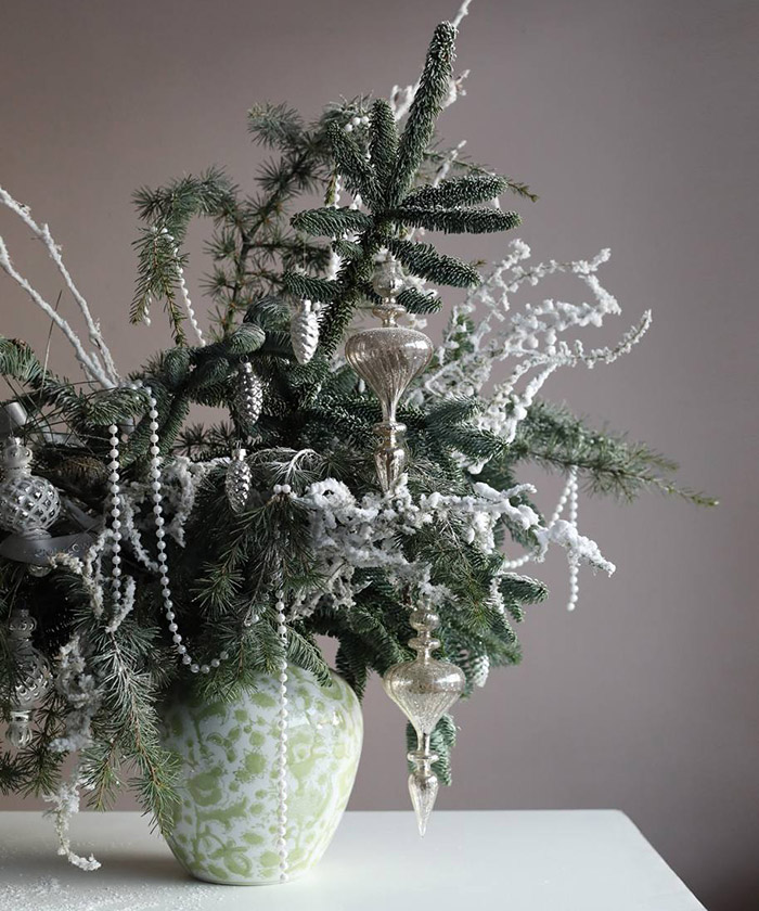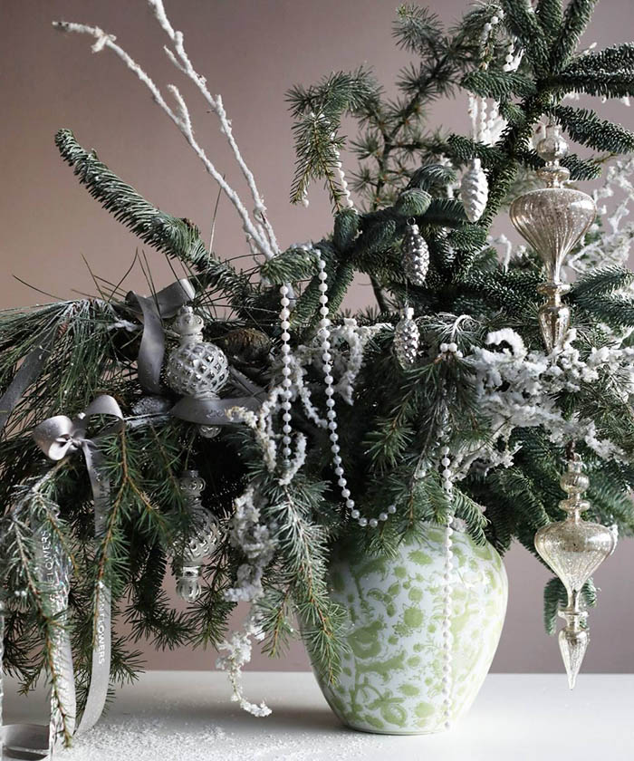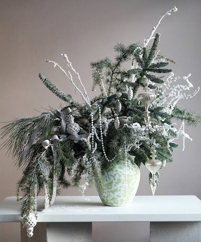 Использована хвоя норвежской ели Нобилис сизый, ветки сосны Pinus, ветки ливанского кедра, заснеженные ветки и стеклянные игрушки из коллекции "Снежные просторы", ваза Шинуазри green